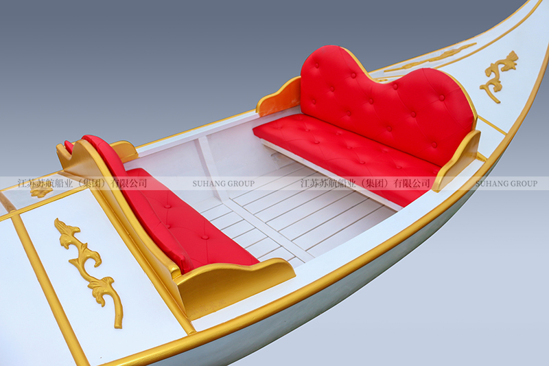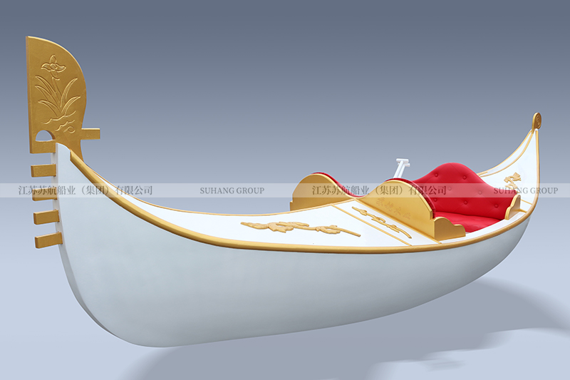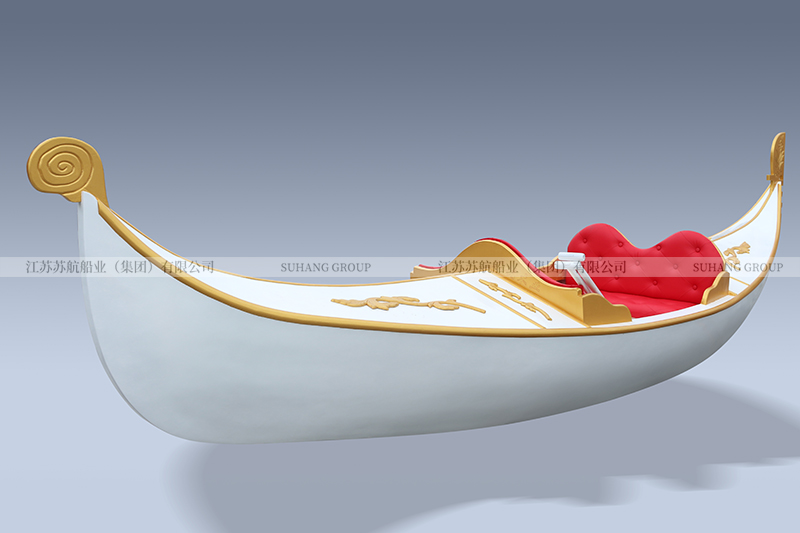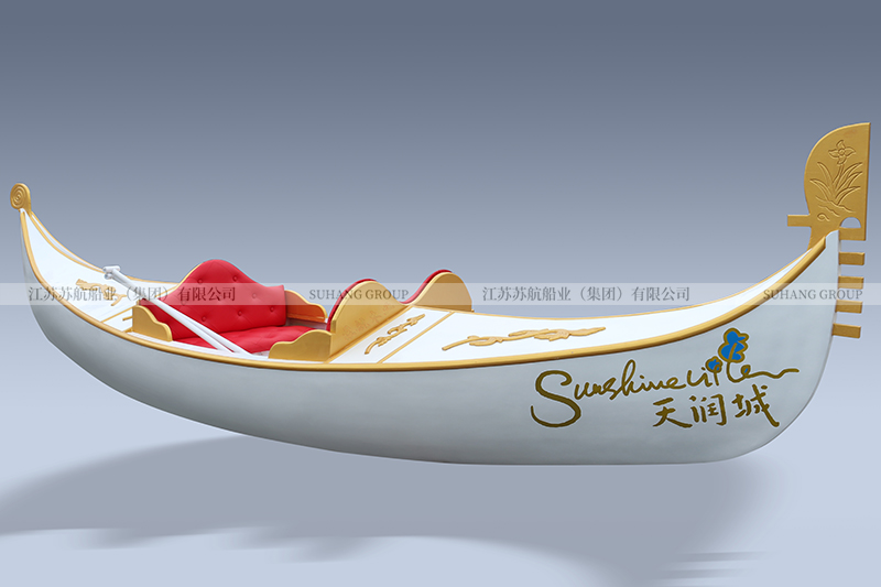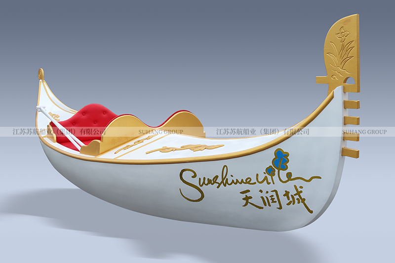 此款貢多拉景觀裝飾船是為南京天潤(rùn)城定制的。貢多拉整體呈白色,船舷、船頭、船尾及座位部分采用金色柳桉木裝飾。船尾有“天潤(rùn)城”中英文藝術(shù)字。此款貢多拉景觀裝飾船長(zhǎng)3米,寬0.7米,主要用于建筑、樓盤、小區(qū)景觀裝飾。