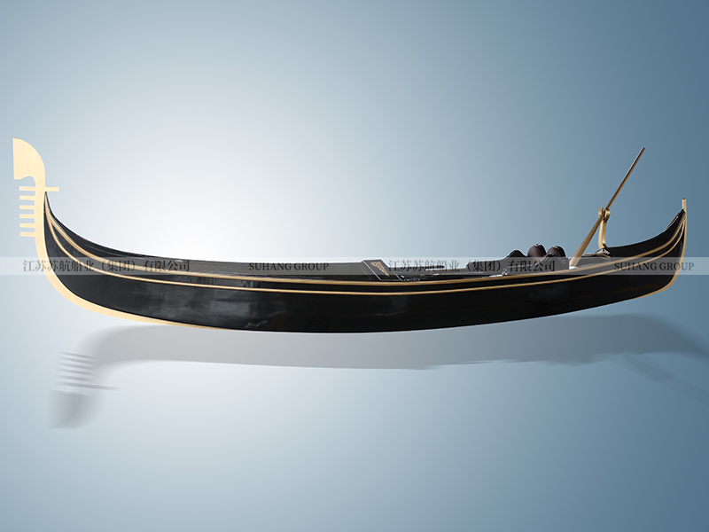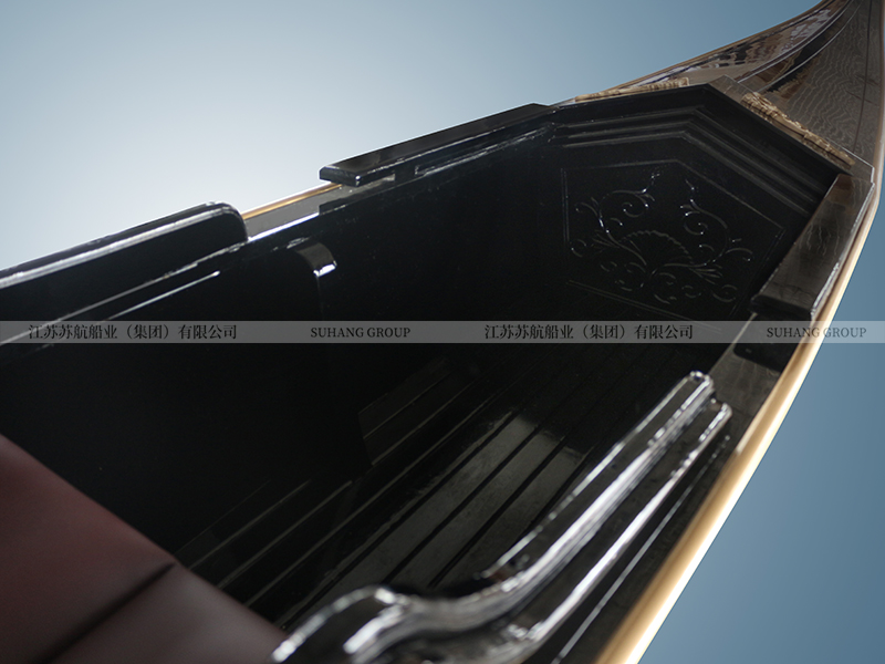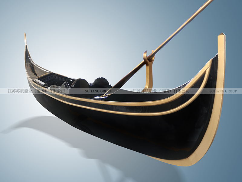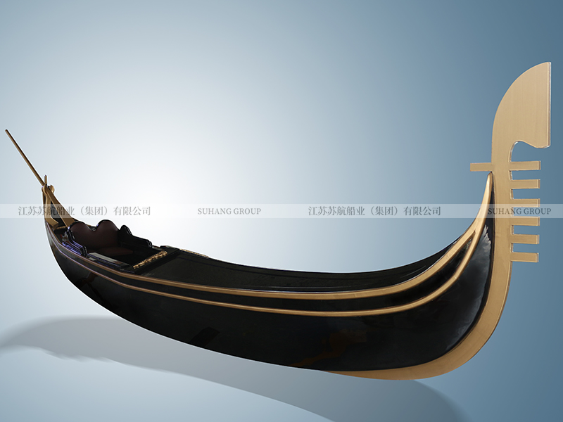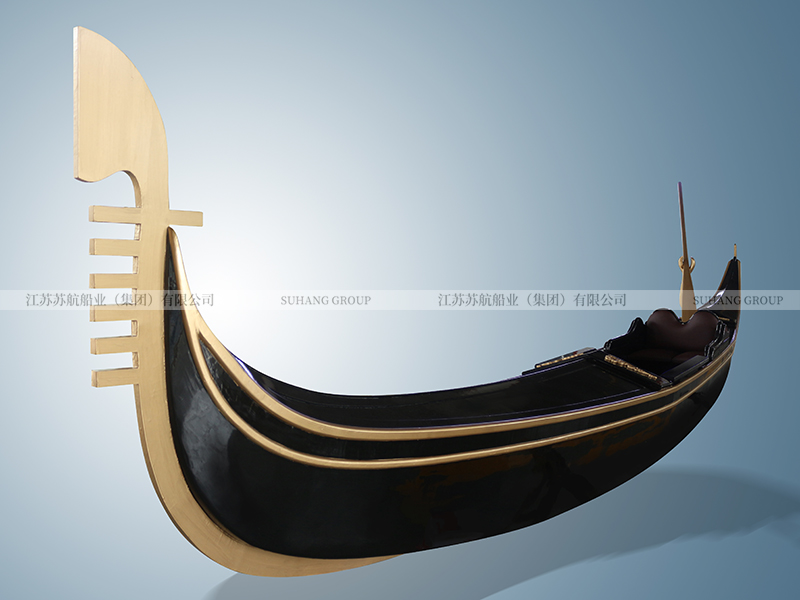 此款豪華貢多拉室內裝飾船采用純玻璃鋼船底+木質上裝,配搖櫓一根,保持原始而簡單的特點,船身漆黑,船體幾乎沒有多余的裝飾。作為室內裝飾船,展示了威尼斯水城文化。