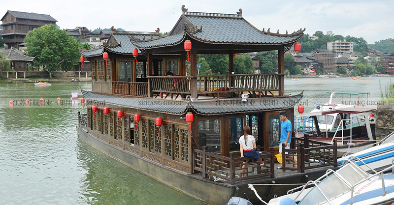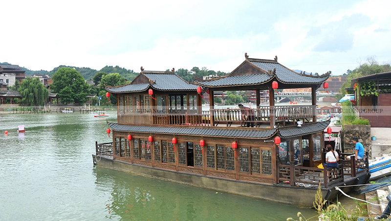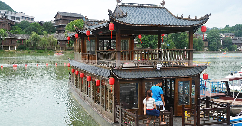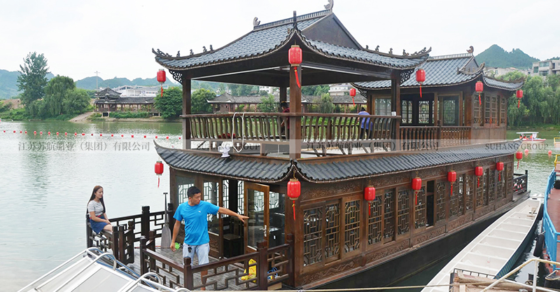 此款式18米雙層多功能畫舫船是集旅游觀光餐飲水上表演服務(wù)為一體的雙層畫舫船。