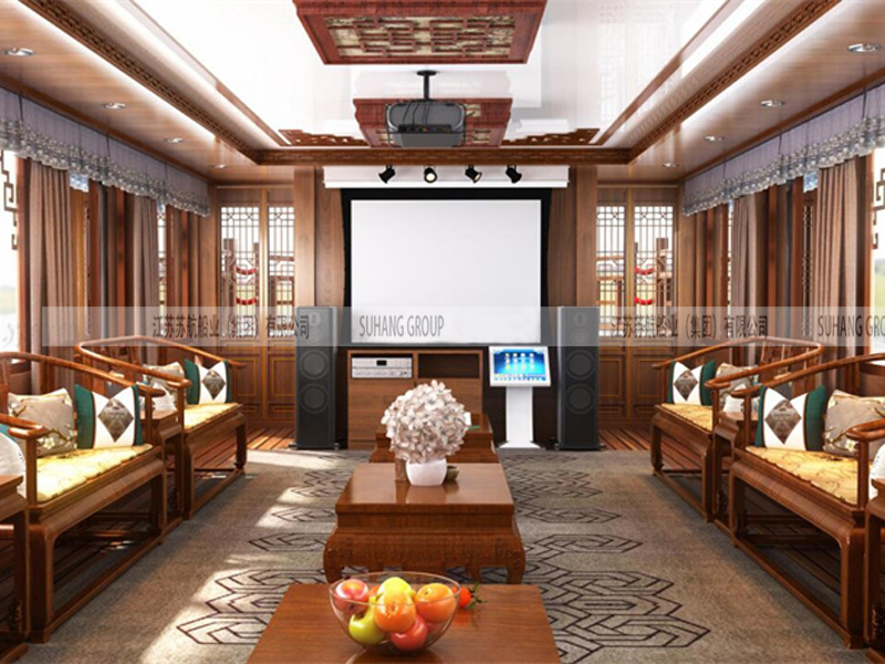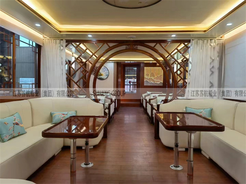 此款22米景區(qū)接待畫舫船采用雙層畫舫船結(jié)構(gòu)設(shè)計(jì),駕駛艙跟接待艙分離。接待艙內(nèi)音響、投影儀、衛(wèi)生間、KTV點(diǎn)歌臺(tái)等設(shè)施一應(yīng)俱全。二層單獨(dú)一個(gè)包間,可以用作餐飲接待。大面積圍欄露臺(tái),可以讓乘客更好地接近大自然,享受自然的美景。樓臺(tái)也可以用于巡回演出、節(jié)目表演等活動(dòng)。