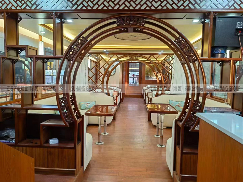 商務(wù)接待畫舫船(景區(qū)接待船)是以招待服務(wù)為主的畫舫船,通常用于觀光和接待活動(dòng)。?商務(wù)接待畫舫船的設(shè)計(jì)融入了古代建筑風(fēng)格,船上的建筑如亭臺(tái)樓閣,飛檐翹角,玲瓏精致。它們通常裝飾華麗,內(nèi)部設(shè)施齊全。