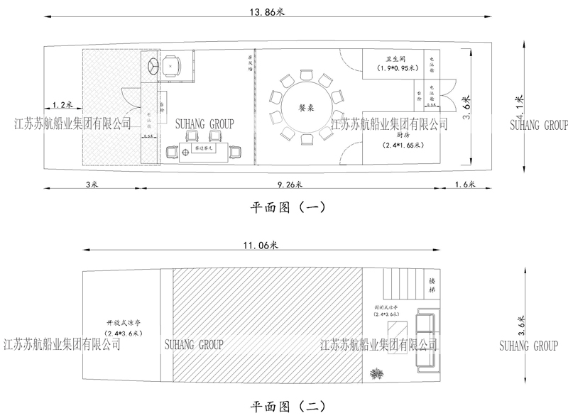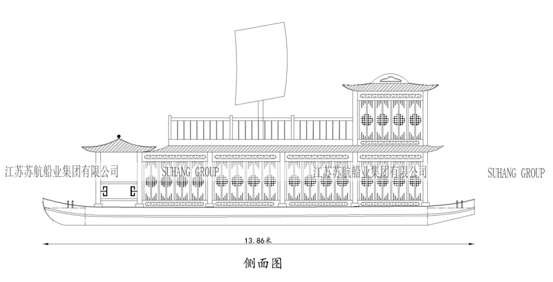 此款仿古餐飲畫舫船是根據(jù)乾隆下江南所乘坐的安福艫號御舟畫舫船定制而成,結(jié)構(gòu)及外觀仿照古代乾隆御舟畫舫,尺寸略有調(diào)整。此仿古餐飲畫舫船采用雙體雙甲板結(jié)構(gòu)設(shè)計,全木質(zhì)打造。第一層總長13.86米,分開放式?jīng)鐾じ忾]式客艙??团摬贾民{駛艙、茶室接待艙、餐廳、衛(wèi)生間、廚房,茶室接待艙跟餐飲艙通過屏風(fēng)隔開。廚衛(wèi)之間設(shè)有樓梯可直接上二層甲板。二層設(shè)有封閉式?jīng)鐾ず痛竺娣e露臺。封閉式?jīng)鐾?nèi)可以作為一個餐飲包廂,也可以作為接待會客廳。露臺可供乘客露天觀光,亦可以作為表演舞臺。
