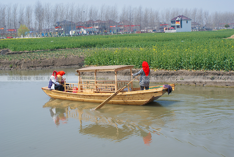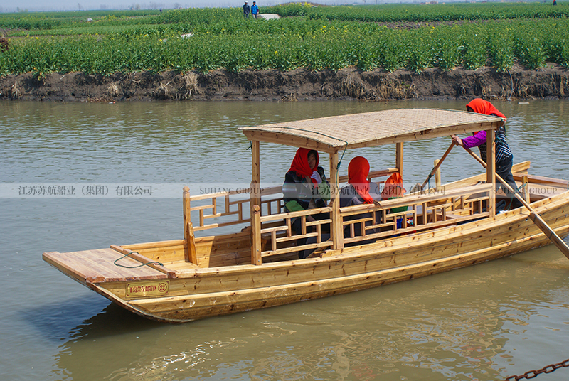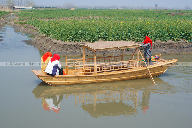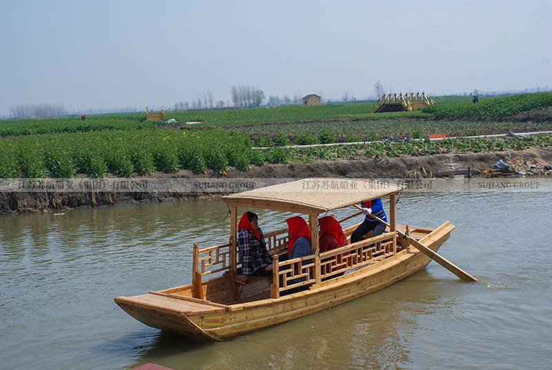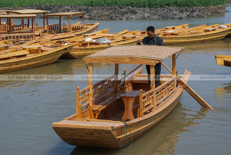 此款手劃觀光船采用有篷設(shè)計(jì)的木船,旨在提供舒適遮陽(yáng)的觀光游玩環(huán)境。船夫在船尾劃船,游客在船蓬內(nèi)觀光、閑聊、品茶,甚是愜意。此手劃觀光船不僅可以作為景區(qū)觀光船,還可以作為休閑聊天品茶的場(chǎng)所。