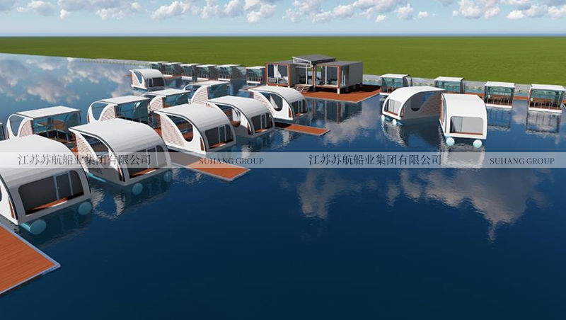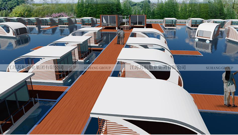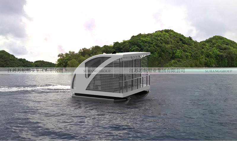 此款小型現(xiàn)代房船采用電動(dòng)動(dòng)力,設(shè)計(jì)航速6-8km/h。