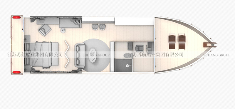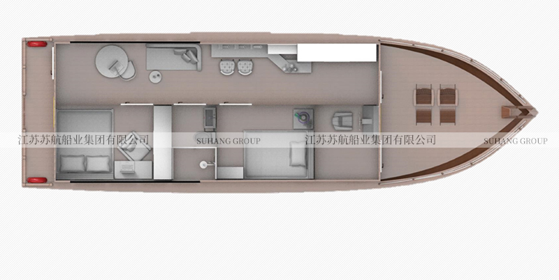 此款水上賓館船根據(jù)需求可以設(shè)置成兩個宿舍也可以設(shè)置成一客廳一宿舍,具體可以根據(jù)客戶需求來選擇。