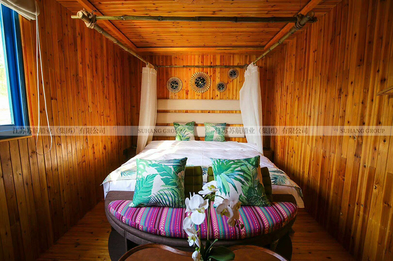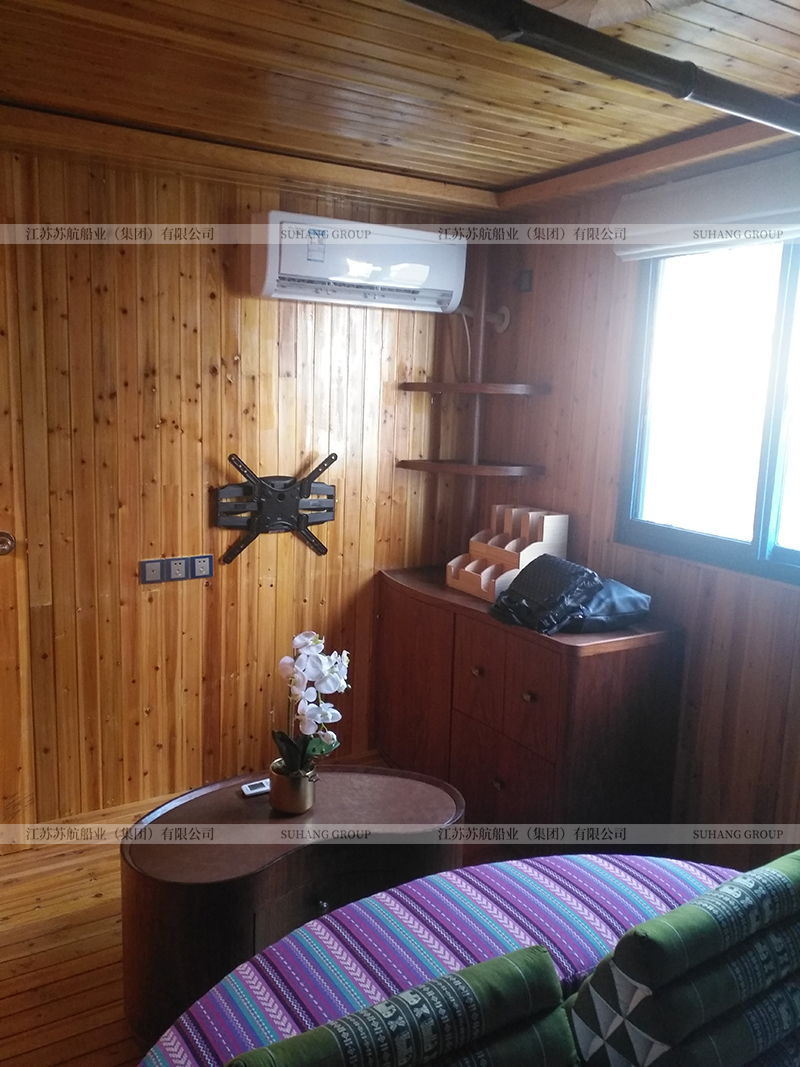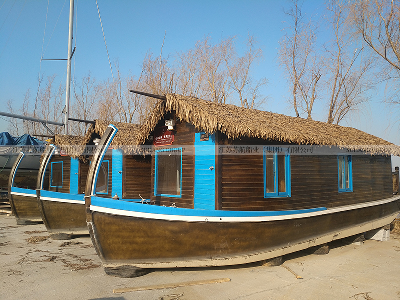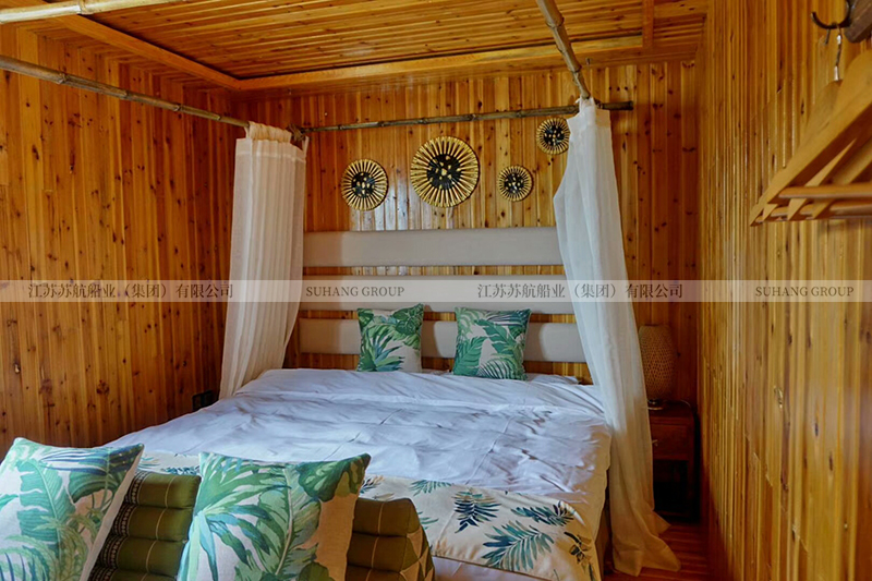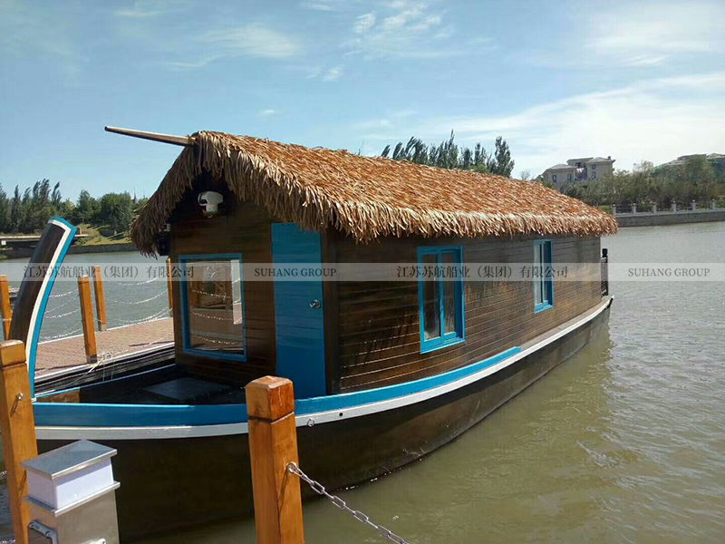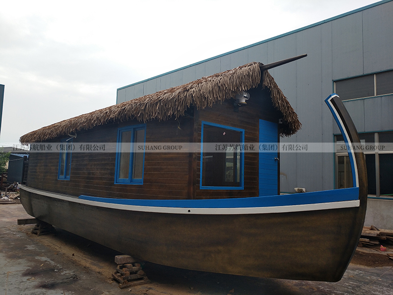 此款馬爾代夫房船的造型借鑒了歐式象鼻船的設計,在房船的船頭設計有長長的彎木。船頂棚采用三角草蓬設計,可以很好的疏水,讓雨水順著房檐流下。整船采用木質材料,配有床、空調、衛(wèi)生間、照明燈具、衣柜、電視等,供游客度假住宿使用。