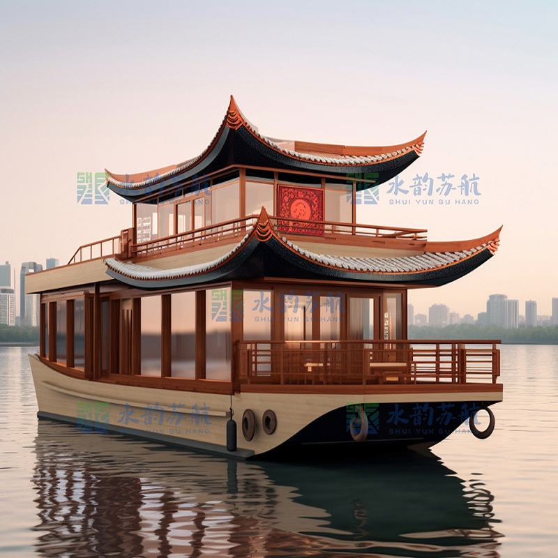 此款中式游艇將古代傳統(tǒng)建筑的神韻與現(xiàn)代休閑相結(jié)合,船艇所用材質(zhì)可以根據(jù)個(gè)人需求來定制。此款新中式游艇結(jié)合了木質(zhì)的美觀和鋁合金的堅(jiān)固耐用,保證了游艇的舒適性和豪華感。